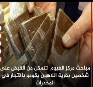 تمكنت الأجهزة الأمنية بمديرية أمن الفيوم وبمرافقة مباحث المركز برئاسة المقدم هيثم طلبه رئيس المباحث مركز الفيوم من ضبط تجار الحشيش” يدعو محمد السقماني _ والعو بعد وصولهم معلومات بفتح دولايب لبيع الحشيش بقرية اللاهون