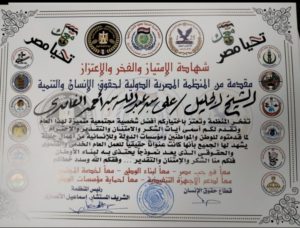المنظمه المصريه الدوليه لحقوق الانسان والتنميه تكرم الشيخ / على بن عبدالله احمد الغامدى احد رموز العمل العام الانسانى على مستوى الوطن العربى واحد رموز القبائل والعائلات العربيه واحد رموز العطاء الذى لايتوقف