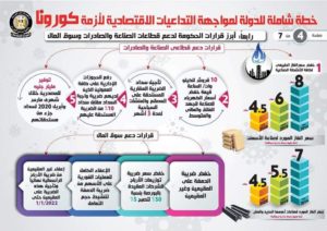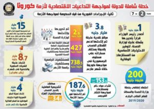 وقد نشر المركز الإعلامي لمجلس الوزراء، إنفوجرافاً سلط من خلاله الضوء على خطة الدولة الشاملة لمواجهة التداعيات الاقتصادية لأزمة “كورونا”، تمثلت في إصدار عدد من القرارات الرئاسية لمواجهة تلك الأزمة، فضلاً عن تبني الحكومة مجموعة من الإجراءات الفورية، واتخاذها تدابير احترازية في موازنة العام المالي 2020/2021، بجانب إصدار قرارات حكومية لدعم قطاعات الصناعة والصادرات وسوق المال، بالإضافة إلى التدابير الاحترازية من قبل البنك المركزي لمواجهة الأزمة.