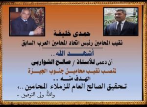 الاستاذ صالح الشواربى….هو الاجدر بمنصب نقيب الساده المحامين بجنوب الجيزه ….وأنه على يقين بأنه سوف يكون فى خدمة النقابه والساده المحامين وسوف تكون فترة قيادته مليئه بالإنجازات والبرامج التى تصب فى نفع جموع المحامين بجنوب الجيزه ..مبروك مقدما ….شهاده حق