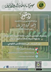 عضو مجلس شباب الأشراف نيابة عن شباب الأشراف من أنحاء المحافظات بجمهورية مصر العربية دعمة و تضامن مع سماحة السيد محمود الشريف نقيب السادة الأشراف بمصر والعالم العربي والإسلامي ودعم القيادة السياسية الحكيمة تتمثل في سيادة الرئيس عبد الفتاح السيسي رئيس الجمهورية ضد تصفية القضية الفلسطينية وضد التهجير