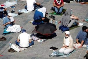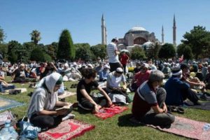 وتجمعت حشود عند نقاط تفتيش حول قلب إسطنبول التاريخي، الذي انتشر به الآلاف من رجال الشرطة، وبعد تخطي نقاط التفتيش جلس مصلون يضعون كمامات على مسافات متباعدة في ميدان السلطان أحمد.
