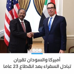 الولايات المتحدة والسودان تقرران بدء إجراءات عملية تبادل السفراء، بعد انقطاع دام 23 عامًا؛ بسبب وضع الخرطوم على قائمة «الدول الراعية للإرهاب» منذ عام 1993
