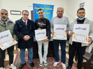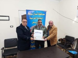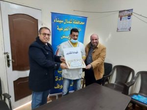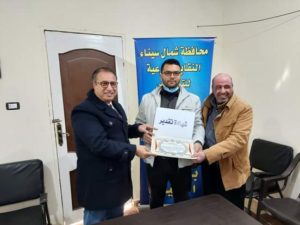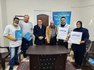 من جانبه ، تفضل مشكورًا الدكتور مختار القاضي نائب رئيس المنظمة المصرية الدولية لحقوق الإنسان والتنمية ، بتقديم شهادات التقدير البلاتينية لأرواح شهداء فيروس كورونا ، وهم : الشهيدة هدى رشاد درويش أبو السعود ، والشهيد أحمد سليمان أعمر ، التي تسلمها الأستاذ حمدان سالم محمد الشلبي نقيب التمريض بشمال سيناء .