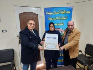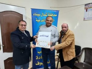 تم التكريم في حضور الأستاذ إبراهيم عبد الله جمعة ، مدير الخدمة الاجتماعية ، ممثلا عن مديرية الصحة بشمال سيناء .