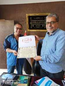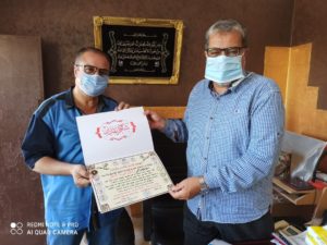 قام الدكتور مختار القاضي نائب رئيس المنظمة بتسليم سيادته شهادة تقدير مهداة من المنظمة ؛ بصفته شخصية عامة وطنية في المجتمع السيناوي ، يحظى بحب واحترام سائر مواطني شمال سيناء .