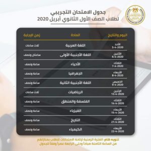 جدول الاختبارات التجريبية للصف الأول الثانوي من ٥ أبريل حتى ٢٢ أبريل ٢٠٢٠ والساعات المحددة لأداء الاختبار في كل محافظة