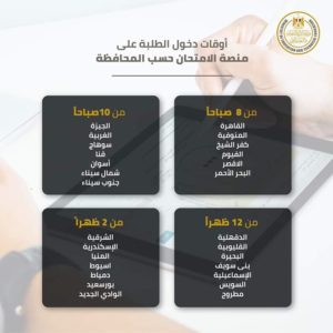 سيتم اتاحة الامتحانات للطلاب بمنازلهم وعلى التابلت في الفترة الزمنية من الساعة الثامنة صباحا وحتى الرابعة عصرا وفقا للجدول، مع العلم أنه يمكن أداء الامتحان من جهاز التابلت أو أي جهاز كمبيوتر أو محمول متصل بالإنترنت عن طريق الواي فاي أو الشريحة، ويمكن للطالب بدء الامتحان في أي وقت خلال الفترة الزمنية المحددة للمحافظة.
