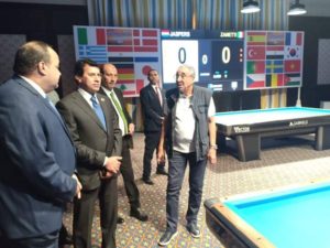 وعلى هامش حضور الدكتور اشرف صبحى منتدي شباب العالم حرص ايضا علي تواجده فى اليوم الختامي للبطولة وكان في استقباله فاروق البرقي رئيس الاتحاد الدولي للعبة وعمرو الخرادلي رئيس الاتحاد المصري للبليارد.