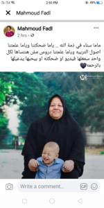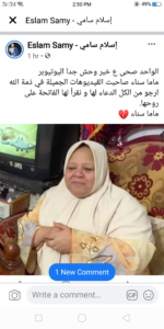 اعلن في صباح اليوم اليوتيبر محمد الشهير بحمو المعروف بمقاطع الفيديو التي تجمع بينه و بين امه ماما سناء بوفاة امه ناشرآ ( ان لله و ان اليه راجعون توفيت الي رحمه الله امي ماما سناء ) و اصبح من بعد هذا المنشور الحزن يسود السوشيال ميديا حيث نشر اشهر اليوتيبر التعازي لحمو و صور ماما سناء اشتهرت ماما سناء بتلقائية مما جعل الناس يحبون مشاهدتها و زاد من معجبينها فهي اشهر ام علي سوشيال ميديا توفيت عن عمر يناهز 61 عامآ بعد صراع مع مرض و ظهرت ماما سناء في برامج كثيره علي تلفاز مثل برنامج واحد من الناس مع عمرو الليثي .. ندعو لماما سناء بالرحمه و المغفره و ننعي ابنائها
