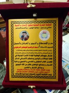ويتمنى ان يرى كل الاشقاء كالبنيان المرصوص والجسد الواحد القوى القادر على البناء قادر على القضاء على الخلافات والصراعات والنزاعات قادر على وأد الفتن…. وان من حق الاجيال القادمه وهم ابناءنا واحفادنا ان يجدوا لانفسهم اوطانا مزدهره ومتقدمه فى كافة المحالات والميادين وان ينعموا بخيراته وموارده التى لاتنضب او تنتهى … هذا وقد تم التكريم من المنظمه المصريه الدوليه لحقوق الانسان والتنميه برئاسة الشريف المستشار اسماعيل الانصارى …