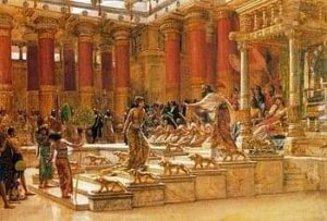 رفض الملك سليمان الهدايا ، فقررت الملكة بلقيس أن تذهب إليه بنفسها ، لتجد عرشها المصنوع من الذهب والجواهر هناك ، فتسلم لله رب العالمين بعد أن رأت عظمة القصر الذي بناه سليمان خصيصا لاستقبالها فيه ، وكان ذا أرضية زجاجية شفافة ، تسبح الأسماك بأنواعها بحرية كاملة أسفلها ، فانبهرت بلقيس وكشفت عن ساقيها ؛ حتى لا تبتل بالماء ، فأخبرها سليمان بأنه زجاج .