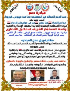 عائلات مصر.. تواجه.. وباء القرن.. فيروس كورونا.. بدعم العماله غير المنتظمه الاكثر تضررا من تفشى وباء كورونا…العماله غير المنتظمه الان بمصر بلا عمل بلا اموال بلا زاد … بالتعاون والترابط والتكامل والتكافل والحب والاخلاص والموده وابتغاء وجه الله سبحانه وتعالى تعبر مصر بعائلاتها من حرب وحصار كورونا منتصره…. معا عائلات مصر تواجه كورونا… معا نعبر الازمه…العلاقات العامه والاعلام والتواصل والمتابعه ا.وائل ابوالحسن الجبلاوى