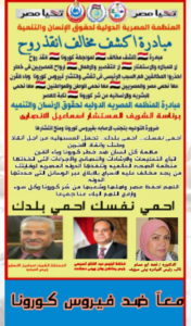 شارك… شارك… شارك… كن معنا لدحر وقهر فيروس كورونا… الى كل مواطن مصرى… اخ.. وصديق… وجار… الى كل اب والى كل ام… الى كل ابن… روحك امانه…. الزم بيتك… احمى نفسك واحمى غيرك.. كلنا فى تحدى ضد فيروس كورونا…كن ايجابى… لانقاذ الانسانيه من وباء القرن… فيروس كورونا… البشريه تنتصر بالتعاون والحرص والالتزام والخوف على الاخرين…