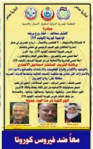 شارك… شارك… شارك… كن معنا لدحر وقهر فيروس كورونا… الى كل مواطن مصرى… اخ.. وصديق… وجار… الى كل اب والى كل ام… الى كل ابن… روحك امانه…. الزم بيتك… احمى نفسك واحمى غيرك.. كلنا فى تحدى ضد فيروس كورونا…كن ايجابى… لانقاذ الانسانيه من وباء القرن… فيروس كورونا… البشريه تنتصر بالتعاون والحرص والالتزام والخوف على الاخرين