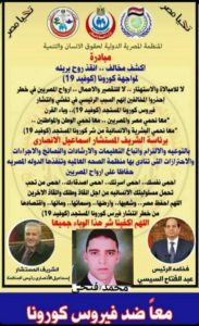 شارك… شارك… شارك… كن معنا لدحر وقهر فيروس كورونا… الى كل مواطن مصرى… اخ.. وصديق… وجار… الى كل اب والى كل ام… الى كل ابن… روحك امانه…. الزم بيتك… احمى نفسك واحمى غيرك.. كلنا فى تحدى ضد فيروس كورونا…كن ايجابى… لانقاذ الانسانيه من وباء القرن… فيروس كورونا… البشريه تنتصر بالتعاون والحرص والالتزام والخوف على الاخرين
