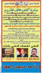 شارك… شارك… شارك… كن معنا لدحر وقهر فيروس كورونا… الى كل مواطن مصرى… اخ.. وصديق… وجار… الى كل اب والى كل ام… الى كل ابن… روحك امانه…. الزم بيتك… احمى نفسك واحمى غيرك.. كلنا فى تحدى ضد فيروس كورونا…كن ايجابى… لانقاذ الانسانيه من وباء القرن… فيروس كورونا… البشريه تنتصر بالتعاون والحرص والالتزام والخوف على الاخرين…