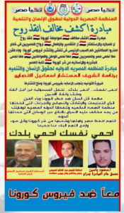 شارك… شارك… شارك… كن معنا لدحر وقهر فيروس كورونا… الى كل مواطن مصرى… اخ.. وصديق… وجار… الى كل اب والى كل ام… الى كل ابن… روحك امانه…. الزم بيتك… احمى نفسك واحمى غيرك.. كلنا فى تحدى ضد فيروس كورونا…كن ايجابى… لانقاذ الانسانيه من وباء القرن… فيروس كورونا… البشريه تنتصر بالتعاون والحرص والالتزام والخوف على الاخرين…