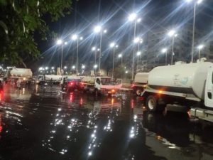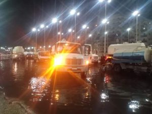 واشار المهندس محمد صلاح رئيس مجلس ادارة شركة مياه الشرب والصرف الصحى الى انه تم الدفع بعدد 1 سيارة ورشة متنقلة ونافورى وعدد 12 سيارة كسح وتجهيز 4 سيارات مياه نقية وجارى اعمال الاصلاح وشفط المياه من خلال فريق التنفيذ الذاتى بالشركة .