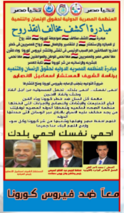 شارك… شارك… شارك… كن معنا لدحر وقهر فيروس كورونا… الى كل مواطن مصرى… اخ.. وصديق… وجار… الى كل اب والى كل ام… الى كل ابن… روحك امانه…. الزم بيتك… احمى نفسك واحمى غيرك.. كلنا فى تحدى ضد فيروس كورونا…كن ايجابى… لانقاذ الانسانيه من وباء القرن… فيروس كورونا… البشريه تنتصر بالتعاون والحرص والالتزام والخوف على الاخرين…