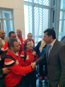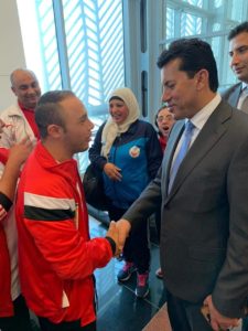 وكان وزير الشباب والرياضة فى مقدمة المستقبلين لجميع أعضاء البعثة المصرية فور وصولهم إلى مطار القاهرة الدولي قادمين من إستراليا عقب نهاية منافسات بطولة العالم للإعاقات الذهنية، وتحقيقهم لعدد 14 ميدالية متنوعة منقسمين إلى 8 ميداليات في ألعاب القوى بواقع 6 ذهب، و ميدالية فضية وميدالية برونزية، و4 ميداليات في تنس الطاولة بواقع ميداليتين فضية و ميداليتين برونزية، وميدالية فضية وأخرى برونزية في منافسات السباحة.